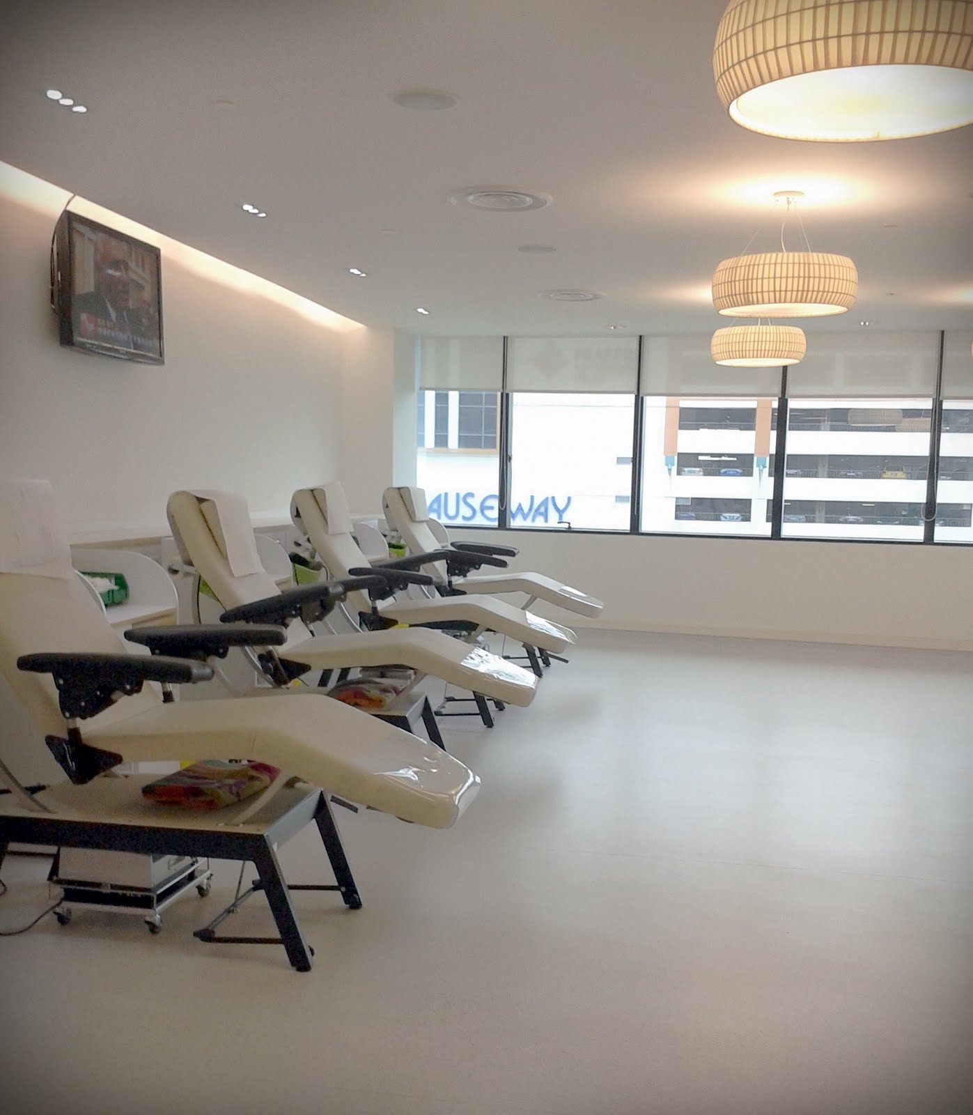 A brightly-lited lounge with comfortable seats for donors to grab a snack before resuming back to their busy lives.