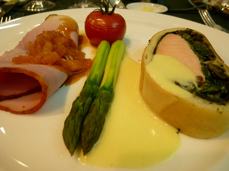 A Christmas dinner isn’t complete without gammon ( widely known as Christmas Ham) or turkey. Gammon is a type of ham that is cured or smoked like bacon. The apple sauce goes pretty well with the honey-glazed gammon. As for the baked salmon, this is quite pleasing to my palette as I really like the way it was paired with Brioche, a enriched French pastry that is rich in eggs and butter. If only,if only… there’s a glass of red wine or rosé to go with the smoked salmon.