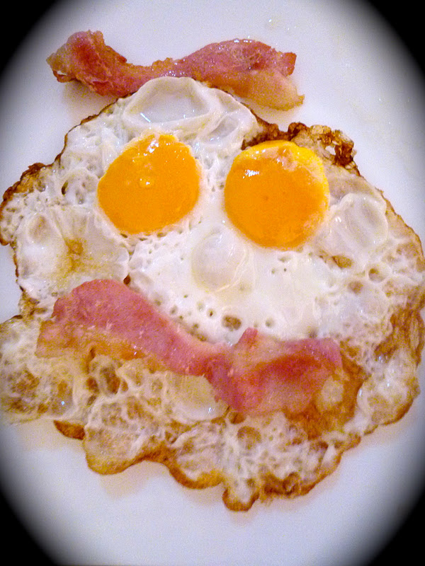 | Bacon and fried eggs for breakfast. |