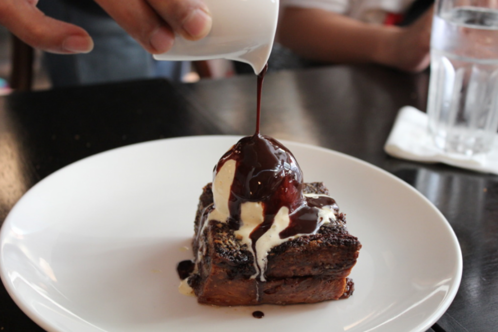 You bet, this jovial waiter here is putting up a little show for us as he drizzles the chocolate sauce all over the ice-cream and bread pudding.