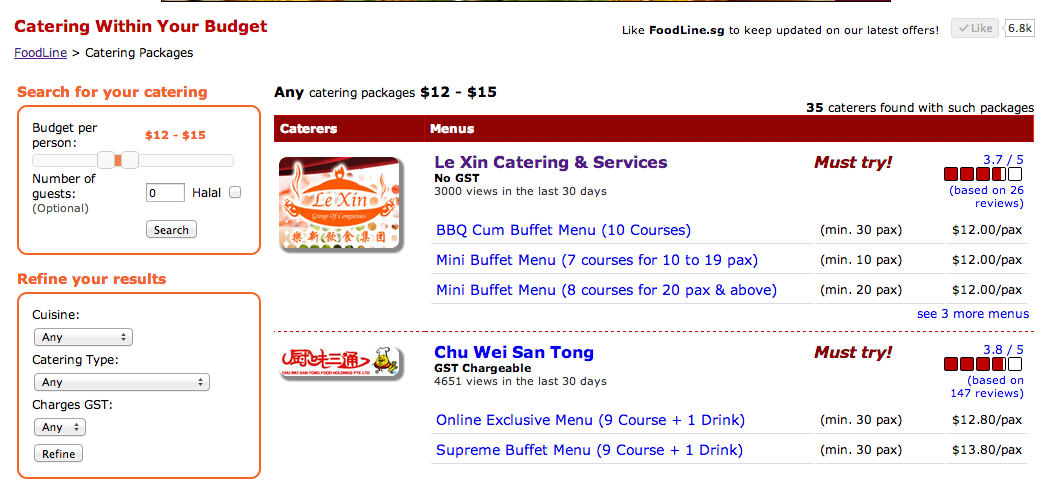 With Foodline‘s easy search options, it’s so much more simpler for you to narrow down your choice to a smaller number of caterers based on your budget,number of guests and type of catering. Whether it’s for a birthday party, business meetings, corporate events, house-warming parties or weddings, you can find a suitable food caterer that meet your budget.