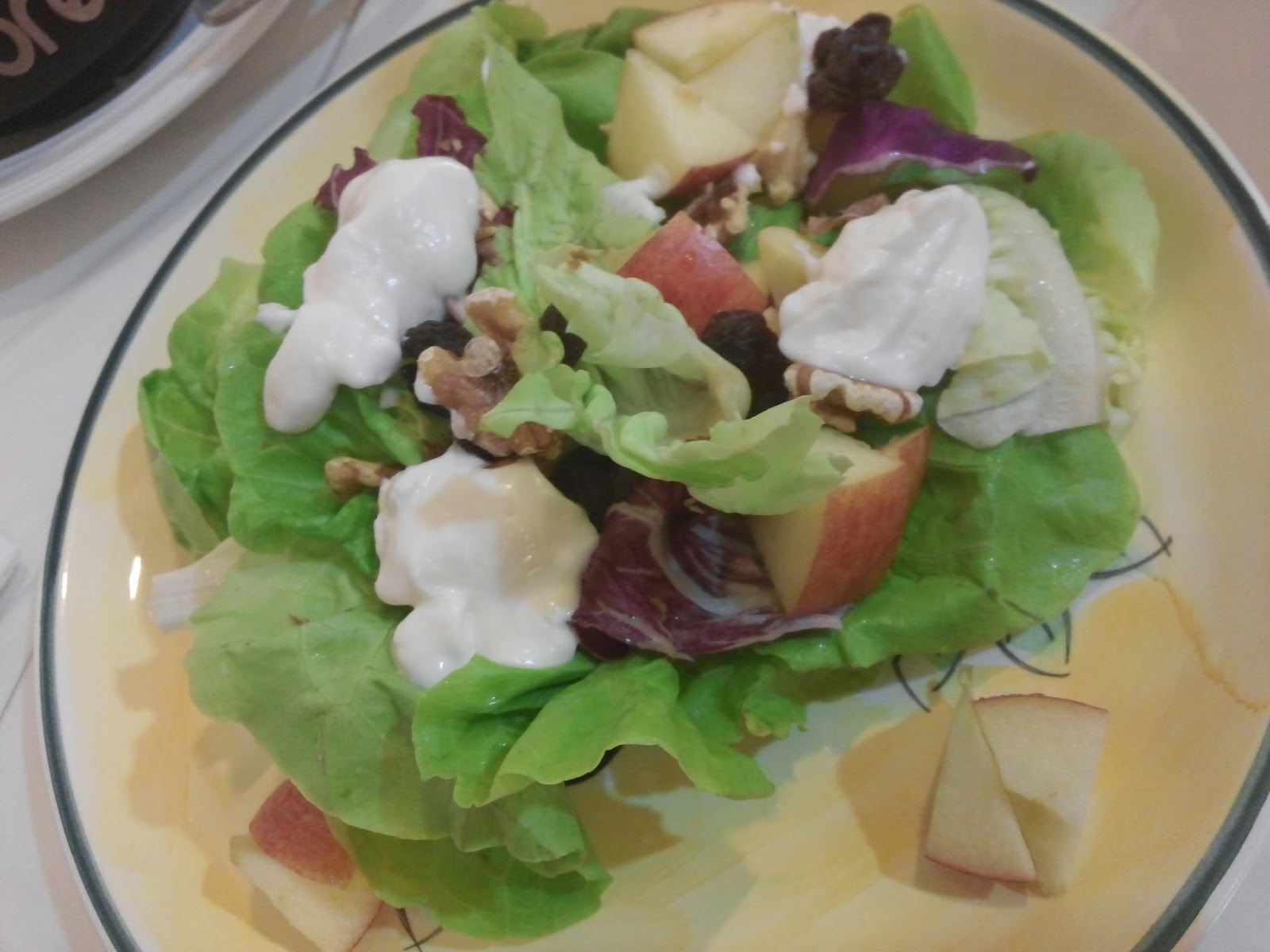 This plate of salad is similar to waldorf salad, a mixed of butter lettuce with apple chunks,chopped walnuts and raisins.