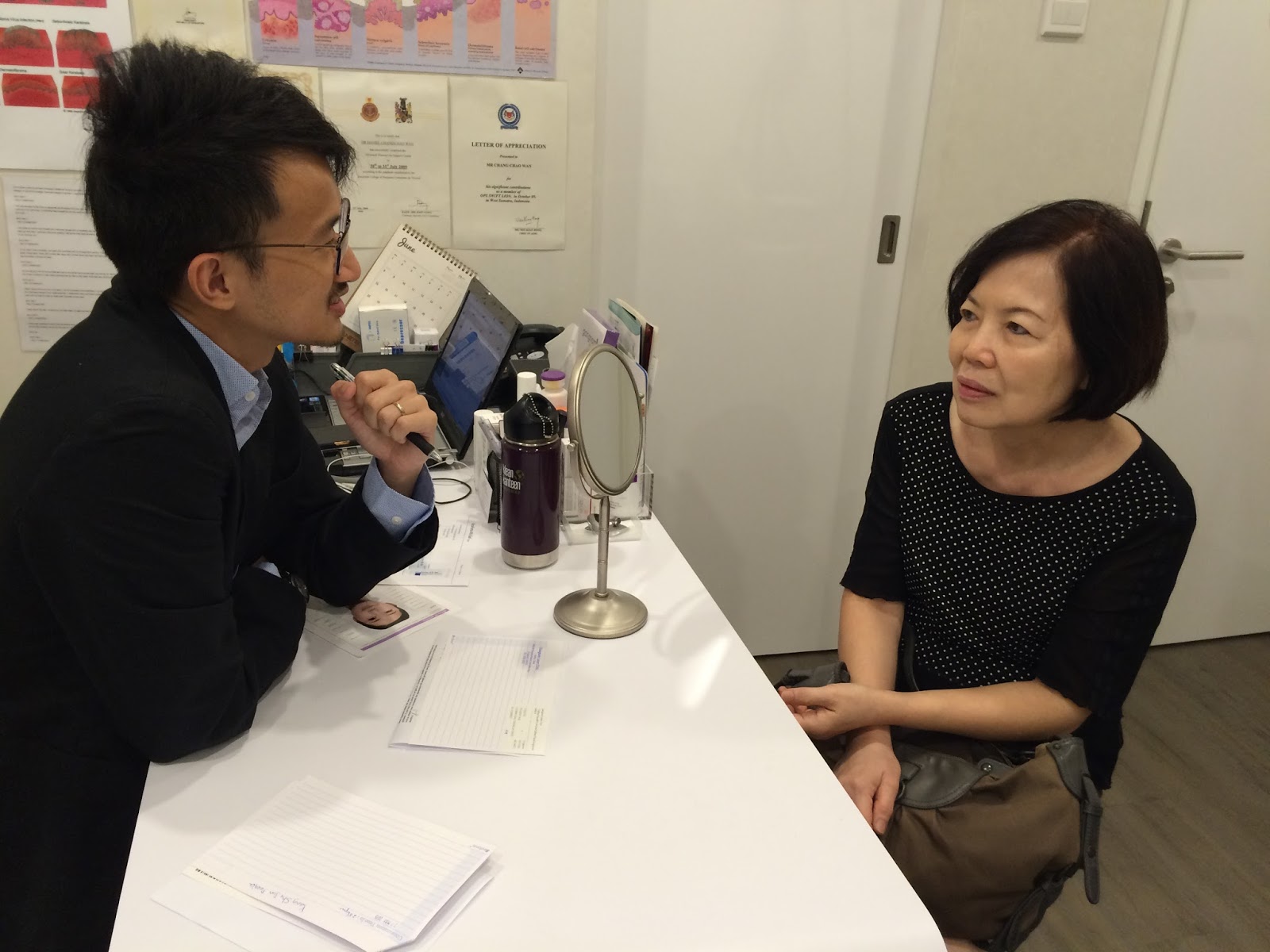My mum sharing all her skin problems and concerns with Dr.Daniel Chang. Both consultation and laser treatment are done by certified aesthetic doctors.