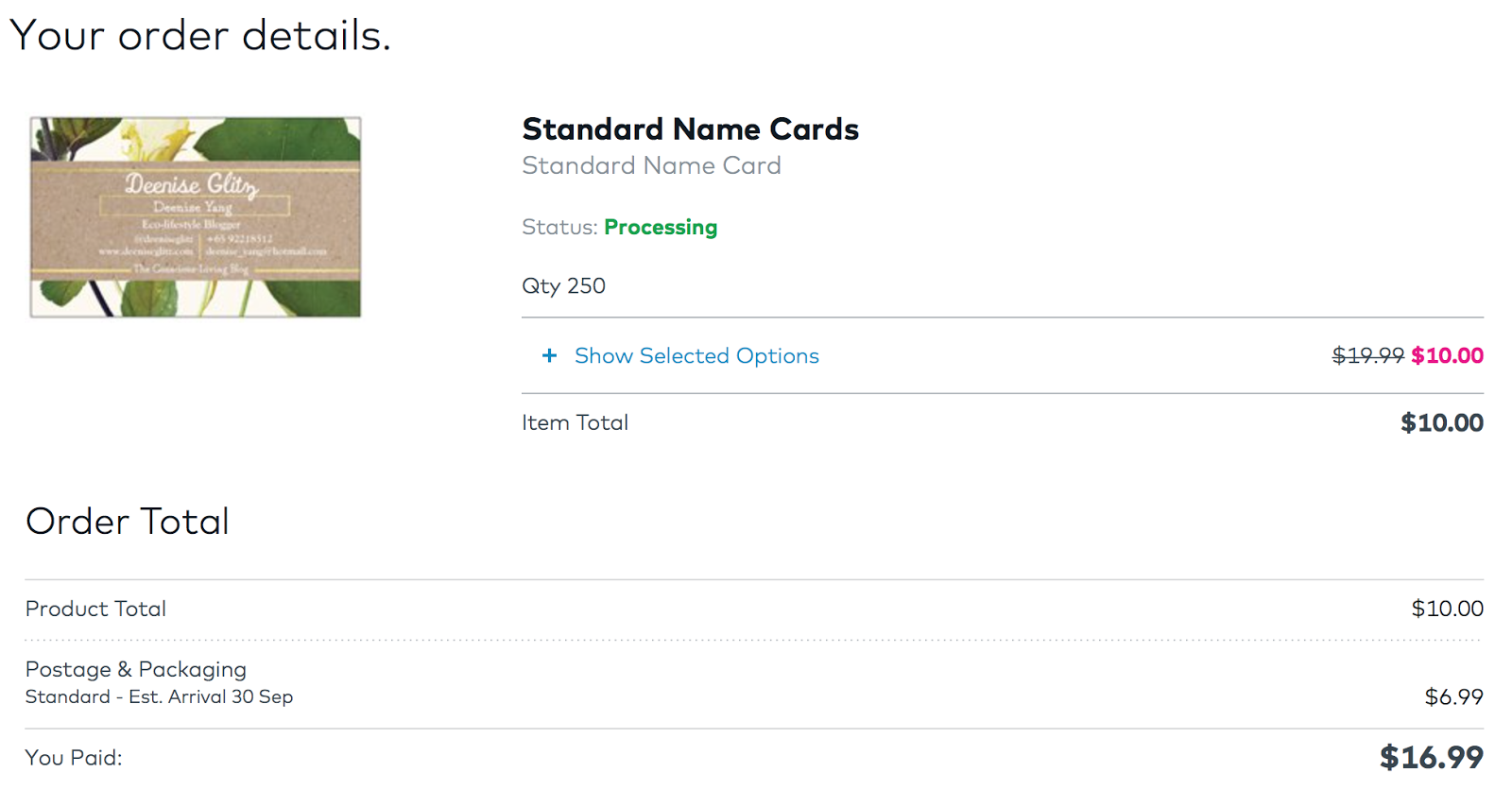 For a pretty reasonable price, I got 250 pieces of standard name card (printed only on one side) at $16.99 which includes postage and packaging costs. The name cards itself only costs $10.