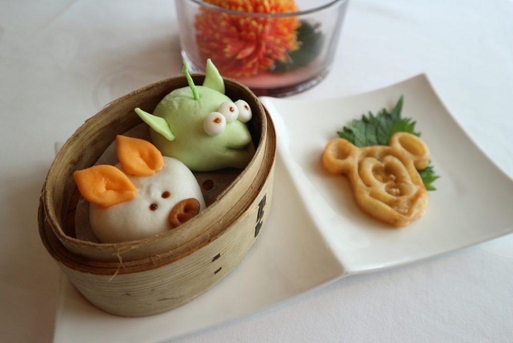 Disney Dim Sum: Three Little Pigs Barbecue Pork Bun, Little Green Men Pork and Vegetable Bun, Mickey’s Seafood Glutinous Pancake