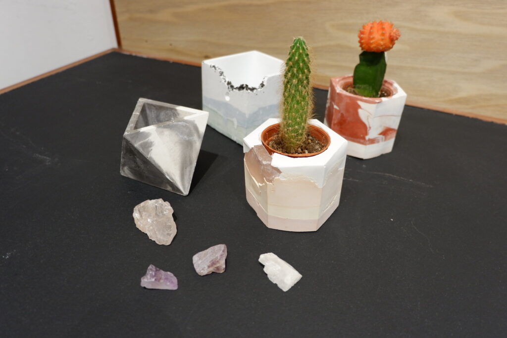 Our instructor gave us a rough idea by showing these samples of concrete pots which we will be making for that particular workshop. I love the marbling and gradient effects on those concrete pots. The studded gem mineral rocks made these pots look very classy and unique.