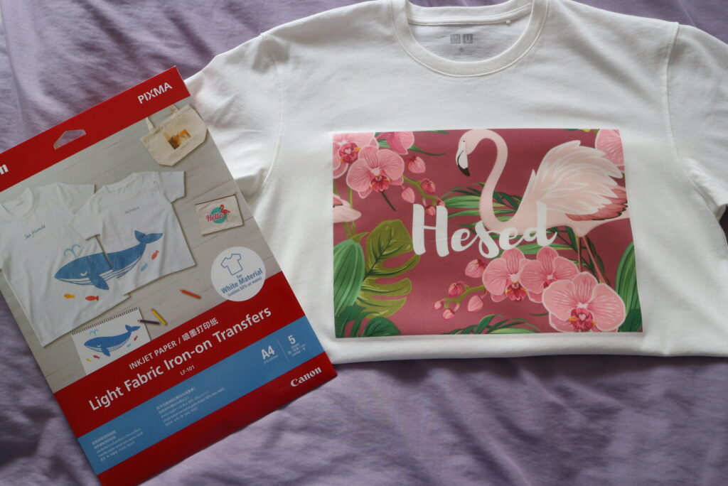 Depending on the colour of fabrics you are working with, you will need to either purchase Canon’s light fabric iron-on transfer or the dark fabric iron-on transfer. Thus if you are working with light-coloured fabrics like pink, yellow or white, you should use the light fabric iron-on transfer. And if you are working with dark-coloured fabrics like navy blue, dark brown or black, then use the dark fabric iron-on transfer. Be sure to buy the correct iron-on transfer for your DIY project!
