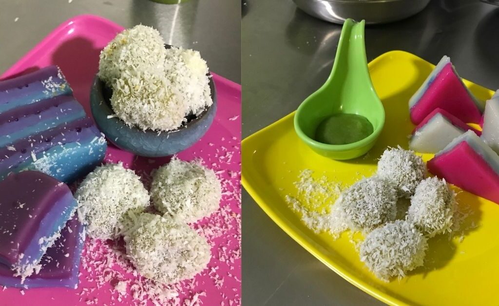 The last snack we made was Ondeh-ondeh. Out of the three traditional snacks, this is the easiest snack to prepare and cook. It took us less than 30 minutes to make the dough, stuff in the sweet fillings and boil it.