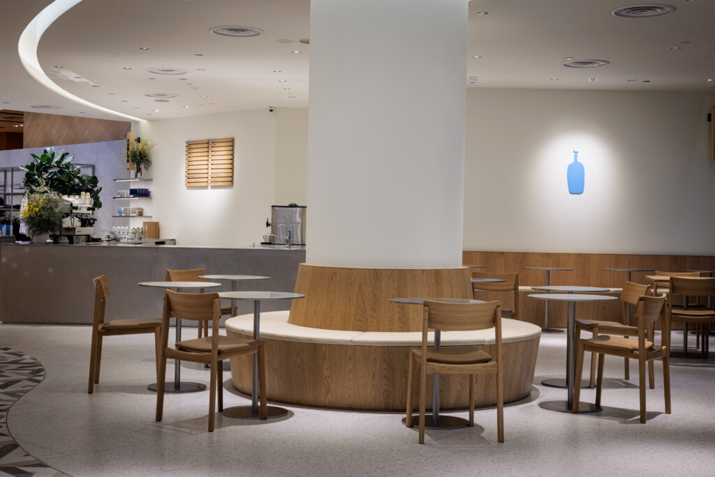 The new 135-square-metre café space is designed to be open and inviting, with no visual barriers, creating a natural flow between guests, baristas, and the café space. The interior has a warm, minimal aesthetic which is also carried throughout their products and spaces.