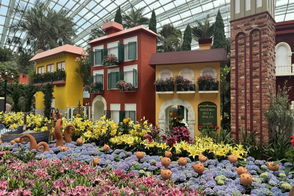 This is Gardens by the Bay’s artistic interpretation of Venice’s famous canals flows through the display, created using blue-hued hydrangeas. You can spot a traditional gondol which is Venice’s distinctive mode of transportation.