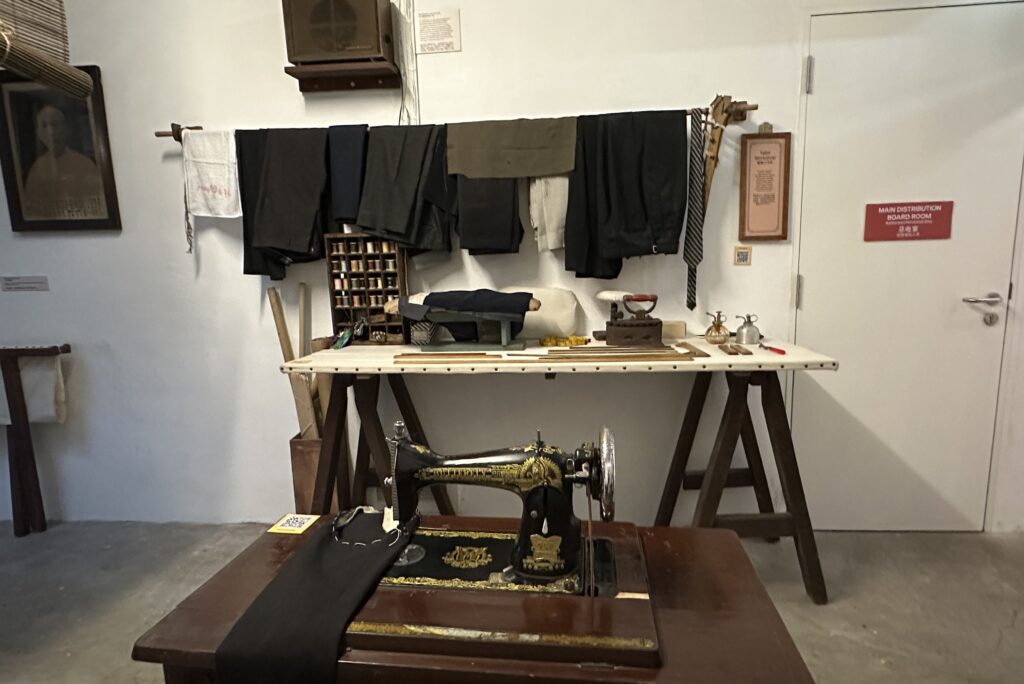 While this simple sewing room might seem cozy for a tailor, the unglamorous work of these tailors lives beyond the flower curtain. A dusty dark lit room with sewing machines squeezed to a side, cigarettes and alcohol on the window sill, a narrow pathway, and the item which caught my utmost attention– a folded canvas bed. The narrative of this portion explains the long hours these tailors worked, with only a foldable canvas bed to rest on if they needed to work the night.