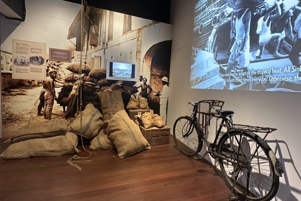 On the left of this film is a section talking about the coolies of Singapore. From how they were named, to their job scope, and sadly even to the amount of abuse they had endured or tragedies they had faced whilst working due to their societal status at the time. Paired with this wall of information are also large bags of rice piled on top of each other, showcasing the kind of physical labour these workers were carrying out without much recognition.